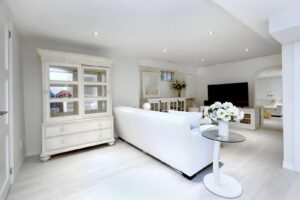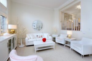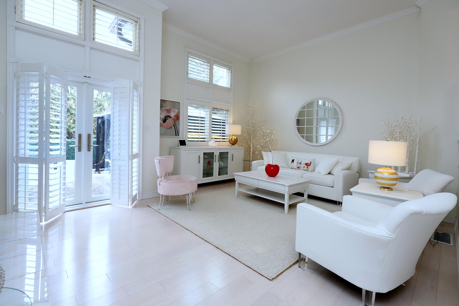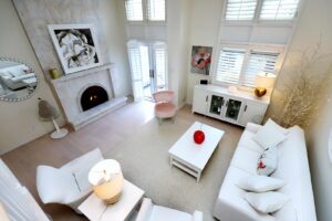 - The Spacious and Sunlit Living Room showcases Cathedral Ceilings with Crown Moulding, Beautiful White Oak Flooring & a Floor to Ceiling Marble Gas Fireplace. Double French Doors leads you to your Private Backyard Patio with Gazebo. All the windows, top to bottom, are adorned with Custom Wood Plantation Shutters.