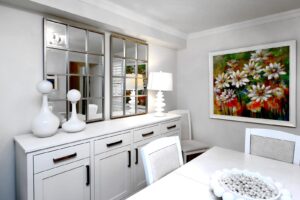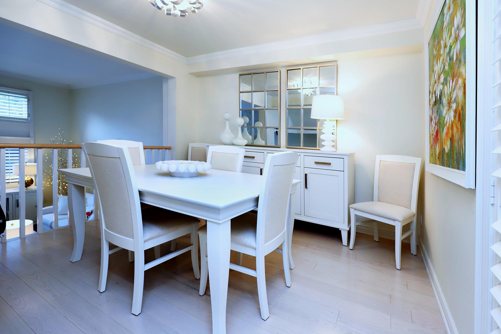 - The Separate Formal Dining Area is Family friendly and directly accessible from the kitchen. Overlooking the Living Room, this lovely entertainment area continues with the matching Crown Moulding, White Oak Flooring & a Gorgeous Modern Chandelier to complete the look.