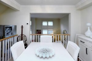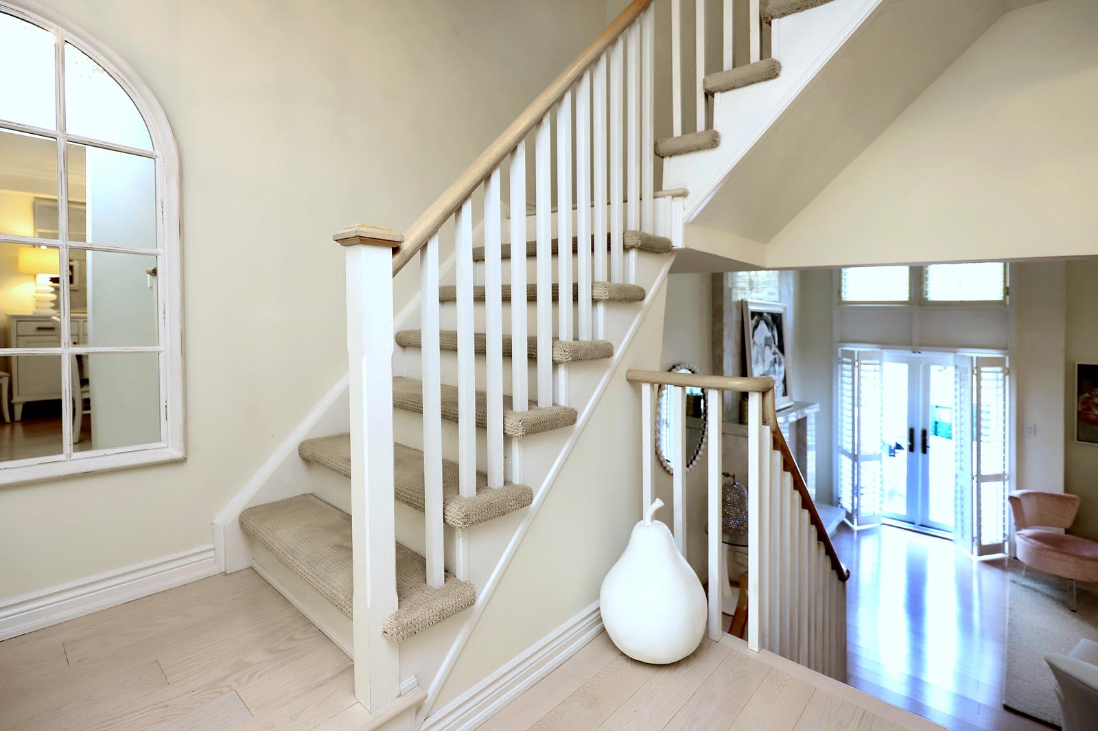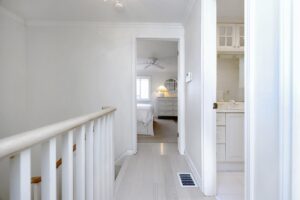 - Going up the stairs, you will note that the handrails have all been replaced with matching White Oak railings & modern wood spindles enhancing the space.