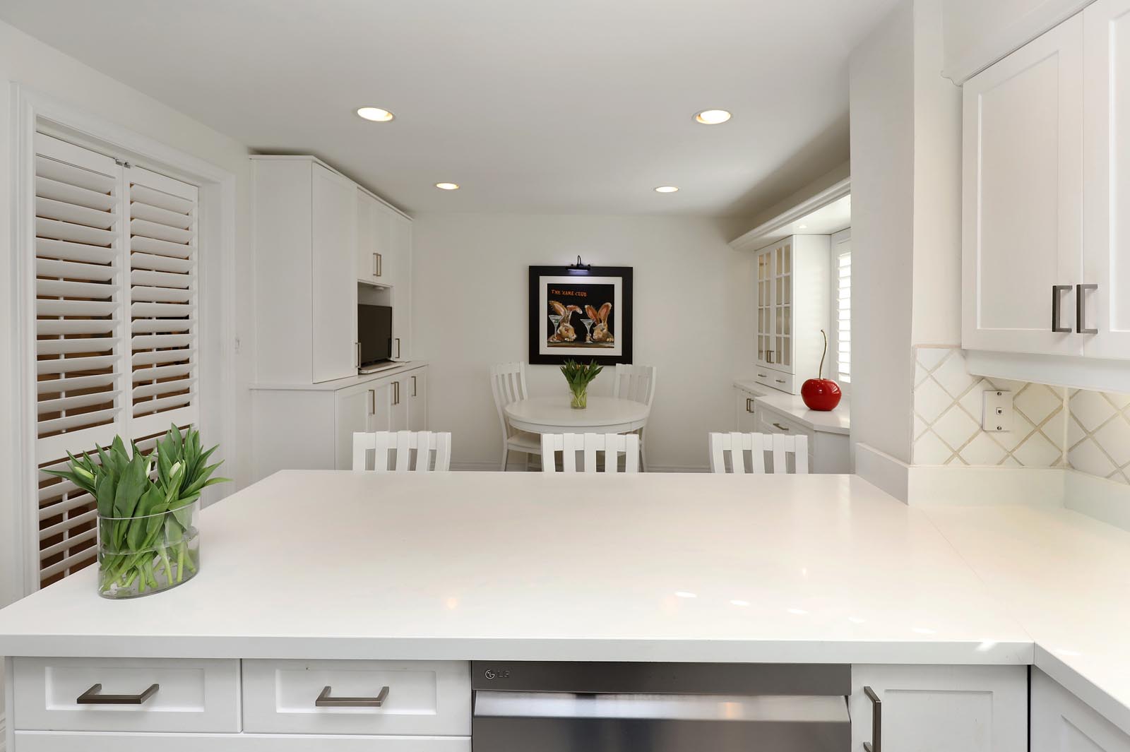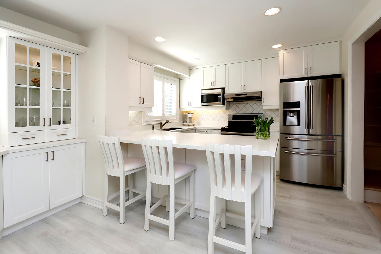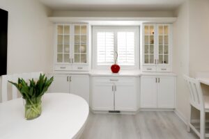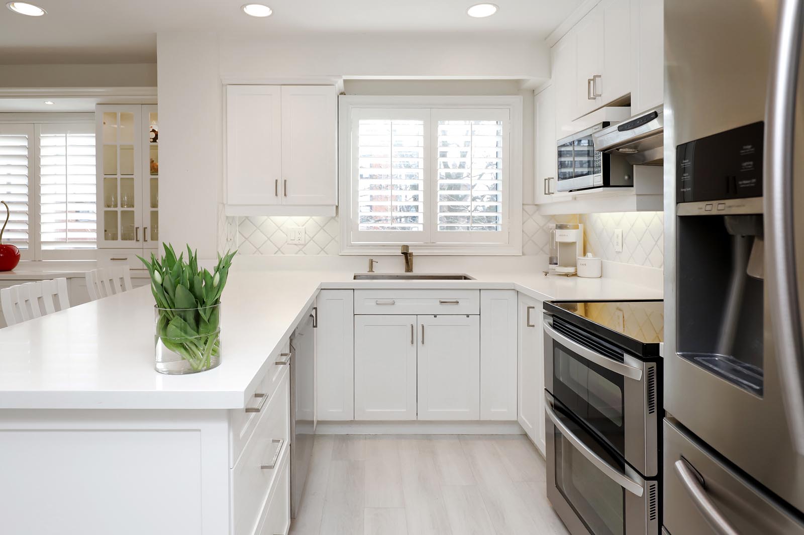- The thoughtfully renovated Kitchen is a great family hub and includes an abundance of beautiful cabinetry with glass accents, Quartz Countertops, Stylish Backsplash & Undermount Lighting, Stainless Steel Appliances, and large windows with Custom Wood Plantation Shutters. Gather family and friends at your Breakfast Bar or seated in the additional Breakfast Area. Same Custom Shutters between Dining Room & Kitchen add to the convenience of privacy/separation when preferred.