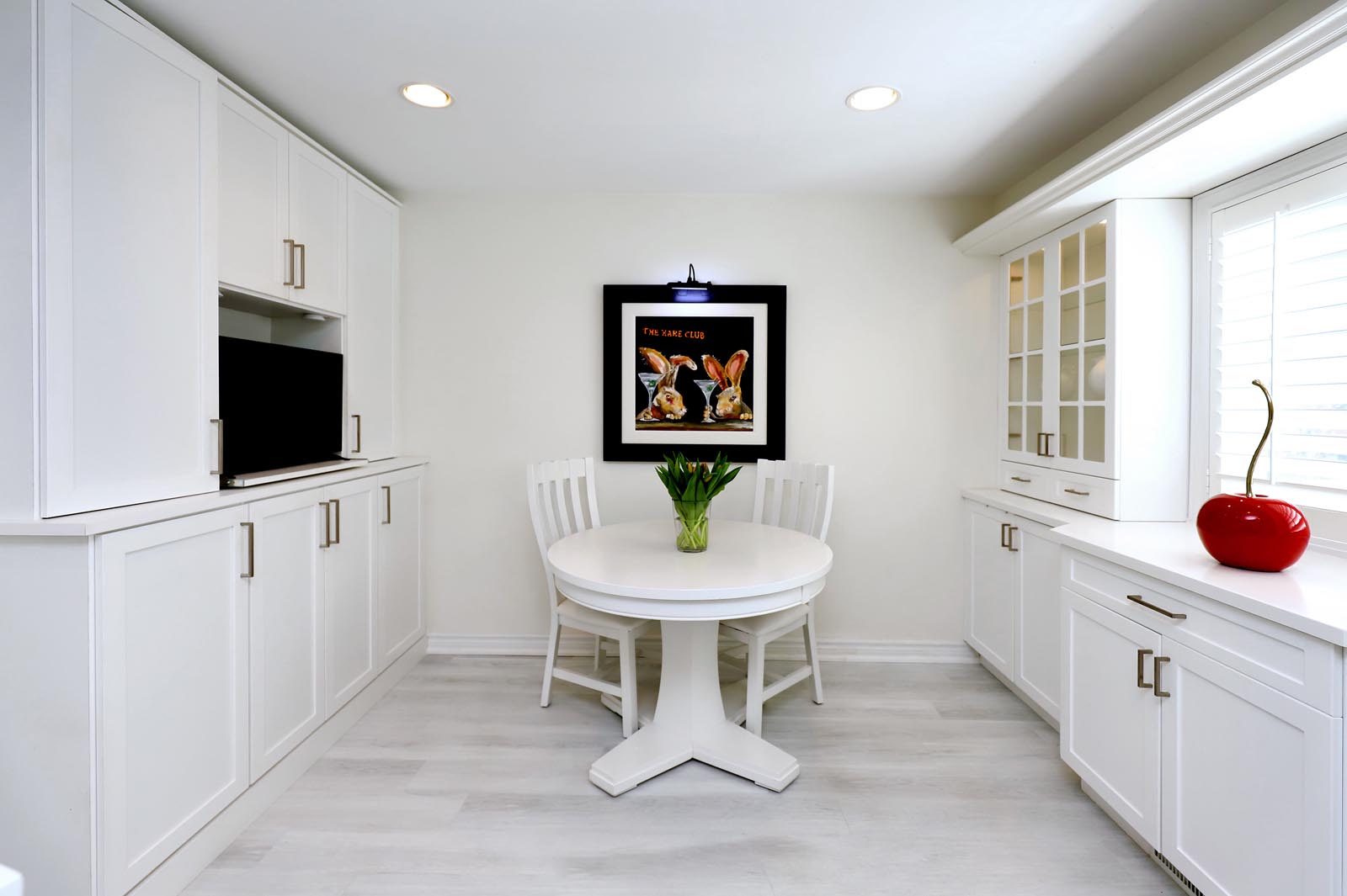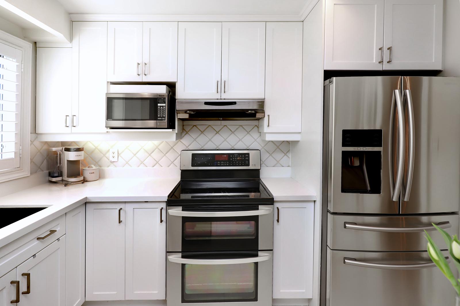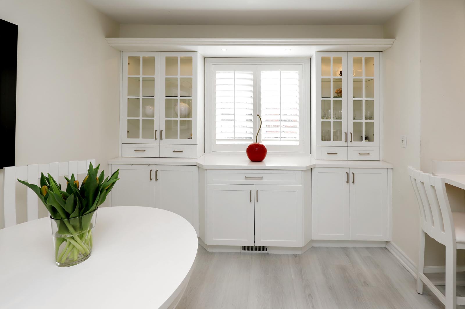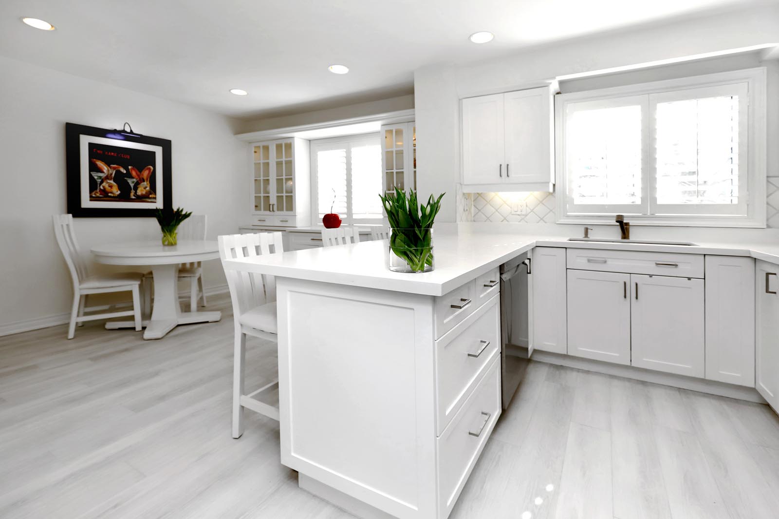 - The thoughtfully renovated Kitchen is a great family hub and includes an abundance of beautiful cabinetry with glass accents, Quartz Countertops, Stylish Backsplash & Undermount Lighting, Stainless Steel Appliances, and large windows with Custom Wood Plantation Shutters. Gather family and friends at your Breakfast Bar or seated in the additional Breakfast Area. Same Custom Shutters between Dining Room & Kitchen add to the convenience of privacy/separation when preferred.